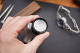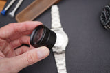 Our new handheld loupe is larger than conventional loupes, so you can see more of the dial, hands or movement. The loupe magnifies 30 times and measures 42,5mm in diameter and 30mm in height. The housing is made of metal and finished in black. If the lenses need to be cleaned, the top ring can easily be removed.