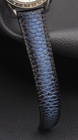 The Fumé dye effect is meticulously applied by hand, creating a stunning gradient effect from black at the edges to blue in the centre, enhancing the strap's individuality and texture.